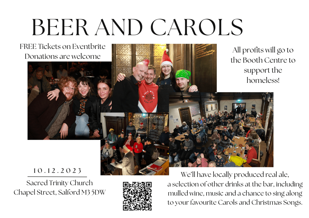 Sunday 10th Sunday at 7pm. Beer and Carols. Raising money for the Booth Centre whilst having a lot of fun! Beer, mulled wine and lots of Christmas songs. Get you free ticket here.